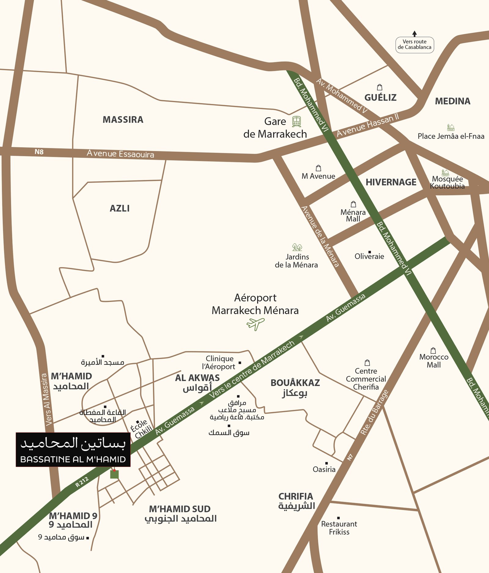 Le projet BASSATINE AL M’HAMID propose des locaux commerciaux situés en rez-de-chaussée des immeubles, avec des façades donnant directement sur les voies du projet, offrant ainsi une excellente visibilité et une accessibilité optimale.